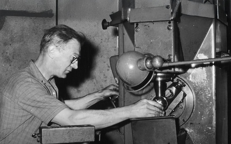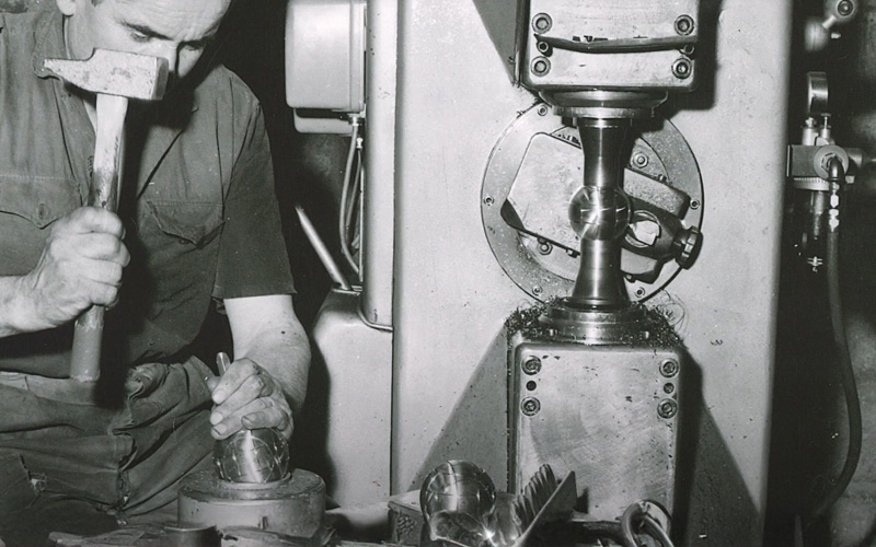 "We would first cut metal discs. Then, once we had enough, we’d dismantle the cutting press and set it up again for stamping. The discs were heated on a gas or oil-fired furnace, and then stamped into half-spheres. Once they had cooled, we’d chamfer them. Then the two shells were manually assembled, the guy would weld them with a rod, and after that, they’d go on to be grooved."